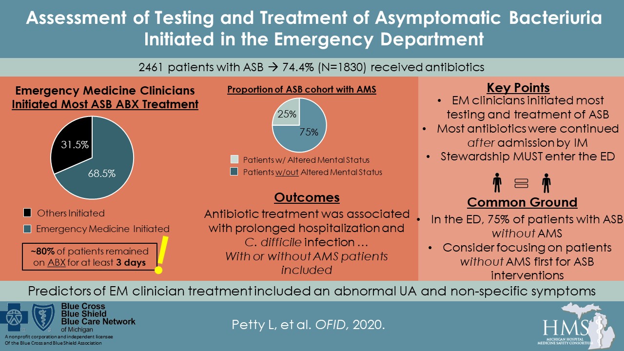 Reducing antibiotic use in patients with asymptomatic bacteriuria (ASB) has been inpatient focused. However, testing and treatment is often started in the emergency department (ED). Thus, for hospitalized patients with ASB, we sought to identify patterns of testing and treatment initiated by emergency medicine (EM) clinicians and the association of treatment with outcomes. Among hospitalized patients ultimately diagnosed with ASB, EM clinicians commonly initiated testing and treatment; most antibiotics were continued by inpatient clinicians. Antibiotic treatment was not associated with improved outcomes, whereas it was associated with prolonged hospitalization and CDI. For best impact, stewardship interventions must expand to the ED.
