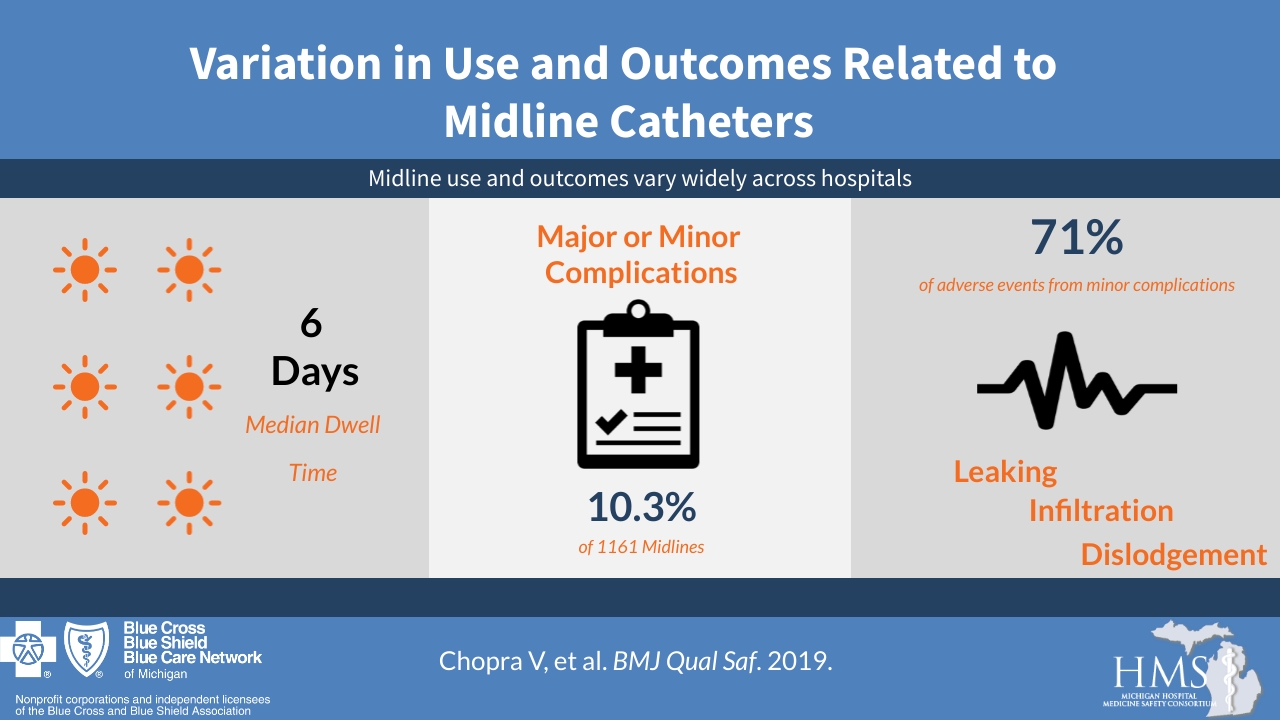 While midline vascular catheters are gaining popularity in clinical practice, patterns of use and outcomes related to these devices are not well known. Midline use and outcomes vary widely across hospitals. Although rates of major complications are low, device removal as a result of adverse events is common.
